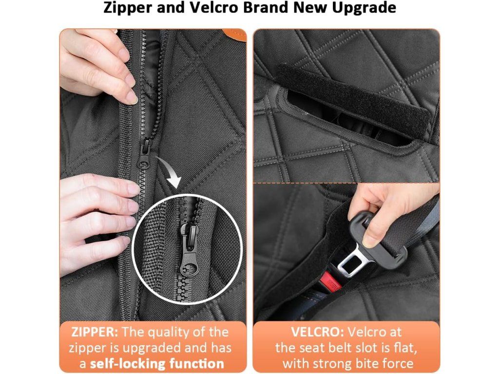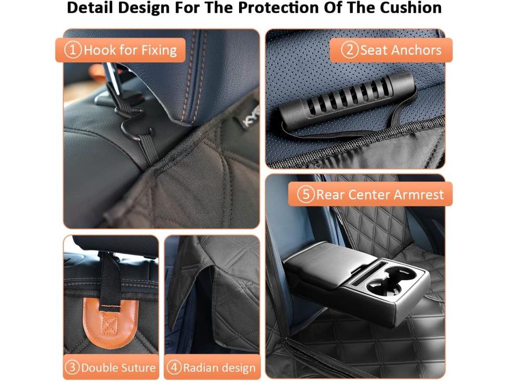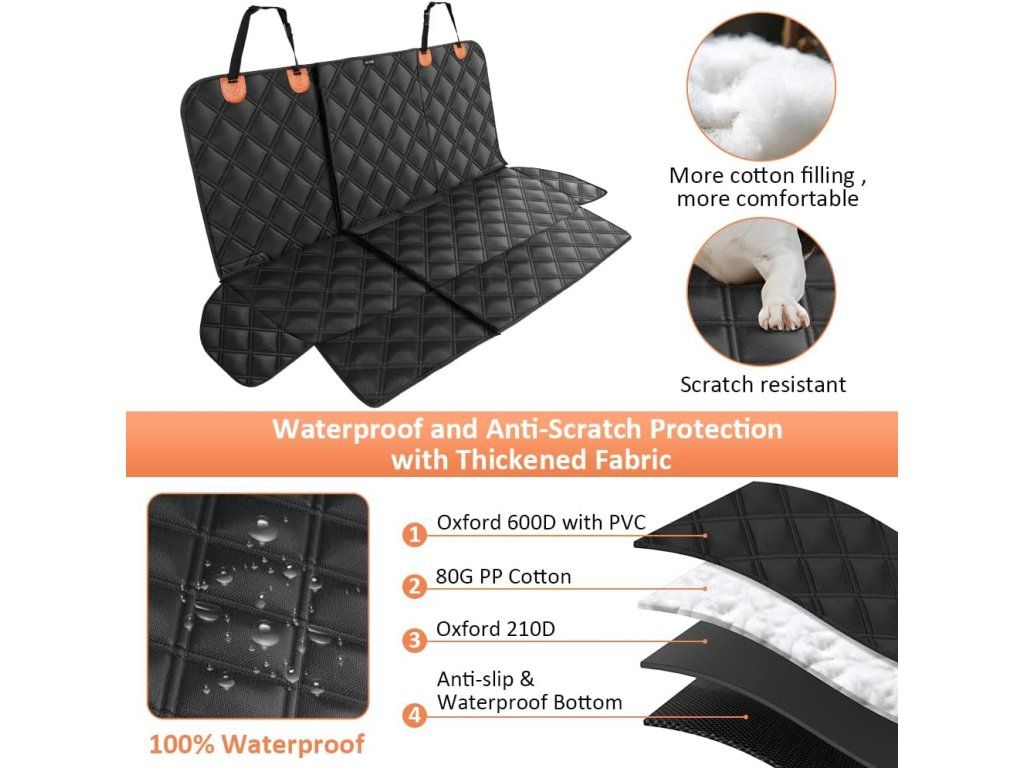 - Voděodolná a odolná proti poškrábání: PVC vrstva a pevné švy zabraňují průniku tekutin a chrání sedadla před drápy a nečistotami.