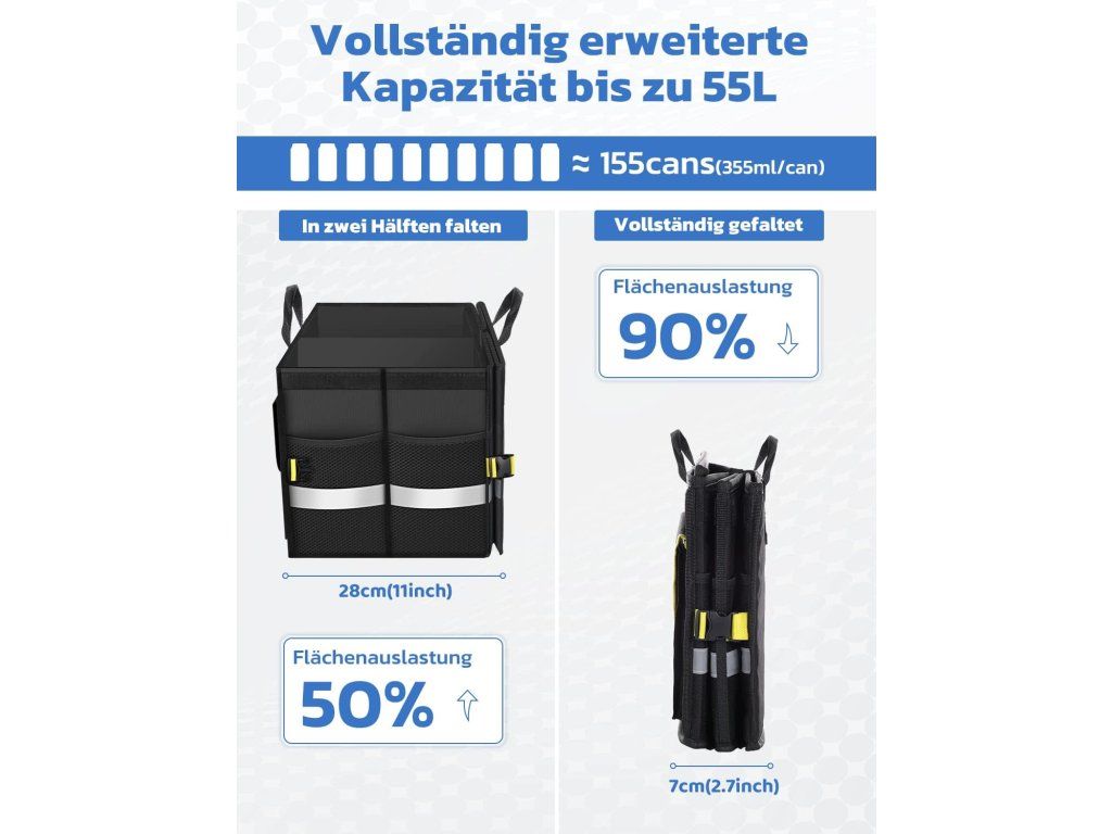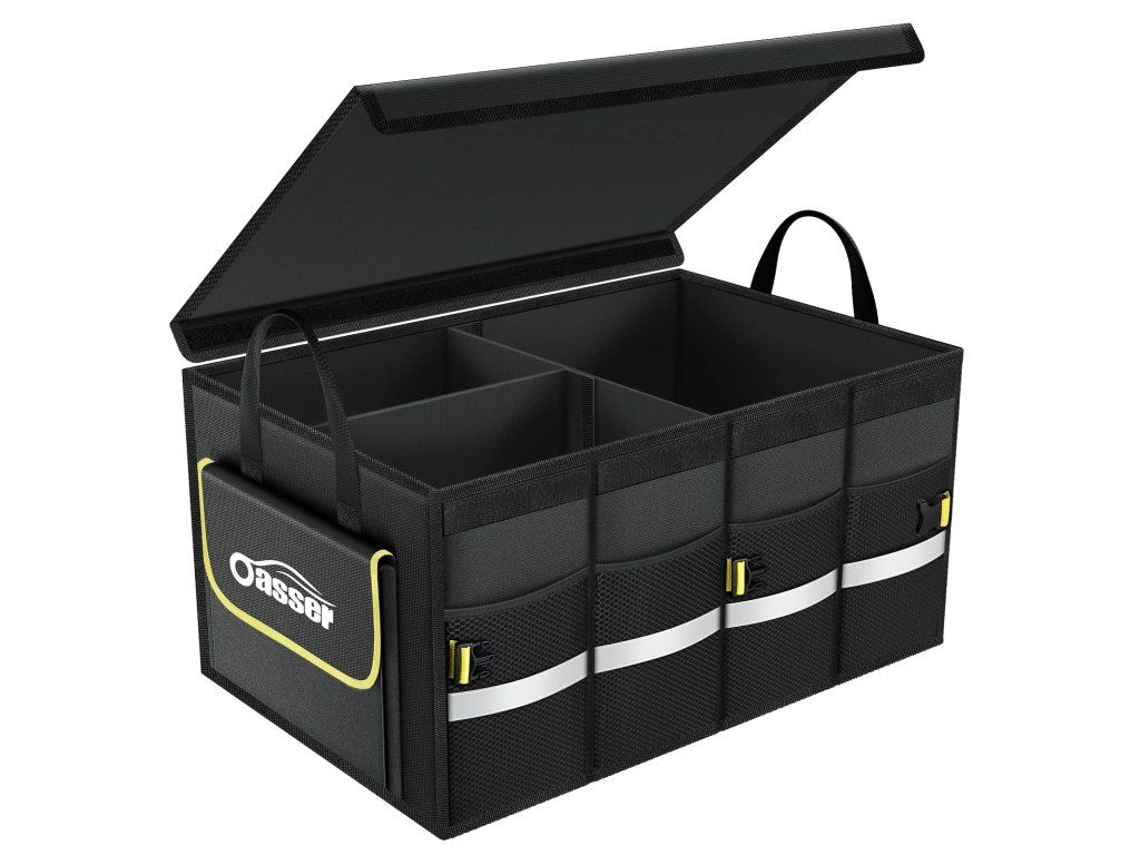 Obsah balení: 1× organizér do kufru (model E3A). Technické údaje: kapacita 55 l; rozměry 35,1 × 55,1 × 26,9 cm (hloubka × šířka × výška); doporučené max. zatížení ~29,94 kg; počet přihrádek 3 (2 odnímatelné přepážky); 4 síťované kapsy; materiál 600D Oxford; barva černá; hmotnost 1 lb (≈0,45 kg); baleno bez zbytečného obalu. Výrobce: Oasser.