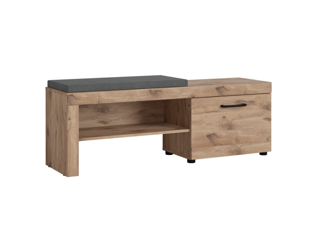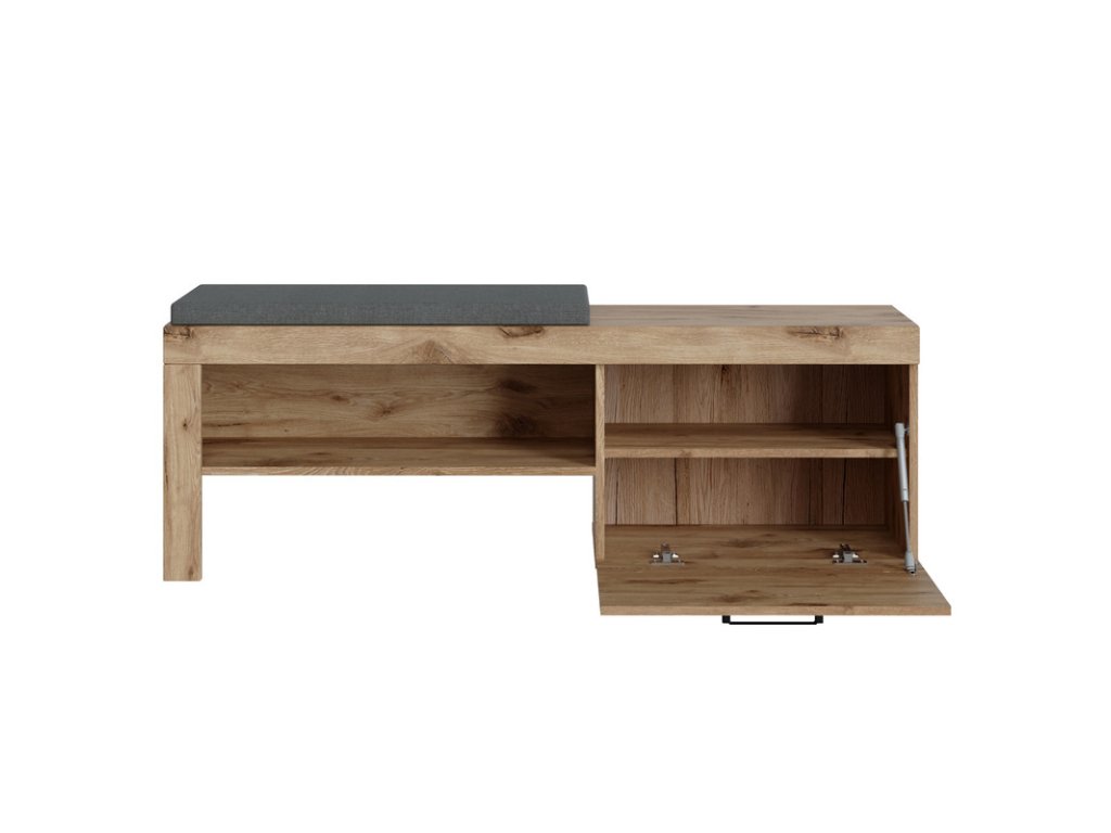 Odkládací prostor je rozdělen na prostor s 1 vloženou policí, který je ukrytý za výklopnými dveřmi, a otevřenou odkládací polici. Veškeré vnitřní vybavení můžete využít pro přehledné uskladnění obuvi a čistících přípravků. Díky polstrovanému sedáku se můžete pohodlně usadit a obout nebo zout boty.