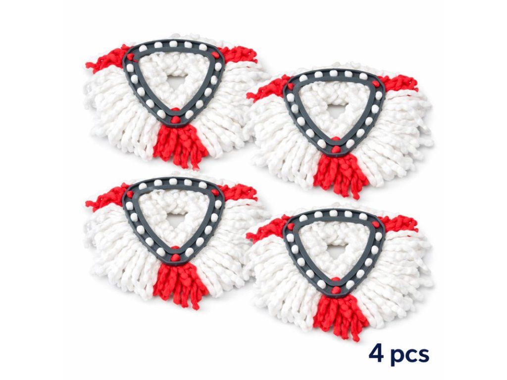 Obsah balení: 4× náhradní mikrovláknové hlavice mopu (červené). Průměry hlavice: vnitřní cca 9,9 cm, vnější strana trojúhelníku cca 14,5 cm