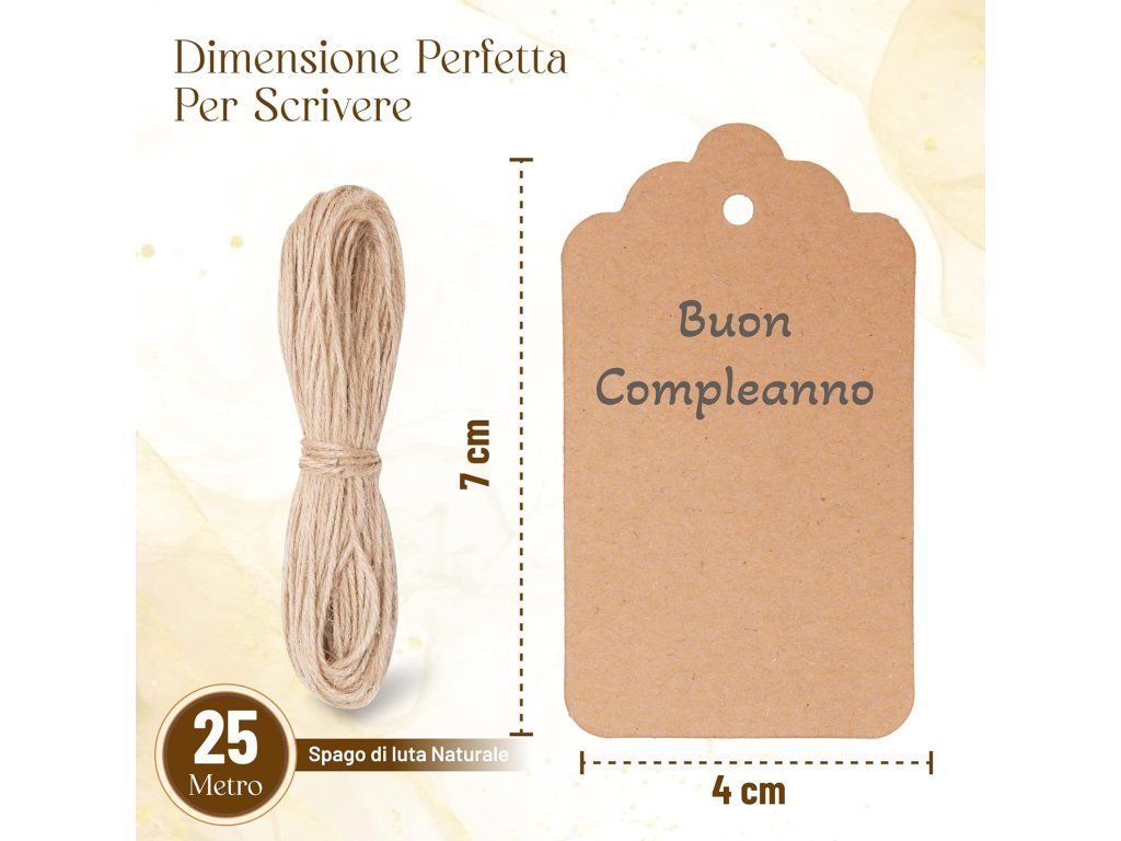 Obsah balení: 150 ks visaček a 25 m jutového provázku. Technické údaje: barva khaki, materiál papír/karton, rozměr 7 × 4 cm, tvar: kulatý, výrobce Kruccar, GTIN/UPC: 196852364923, ASIN: B0BCGYBVJ2.