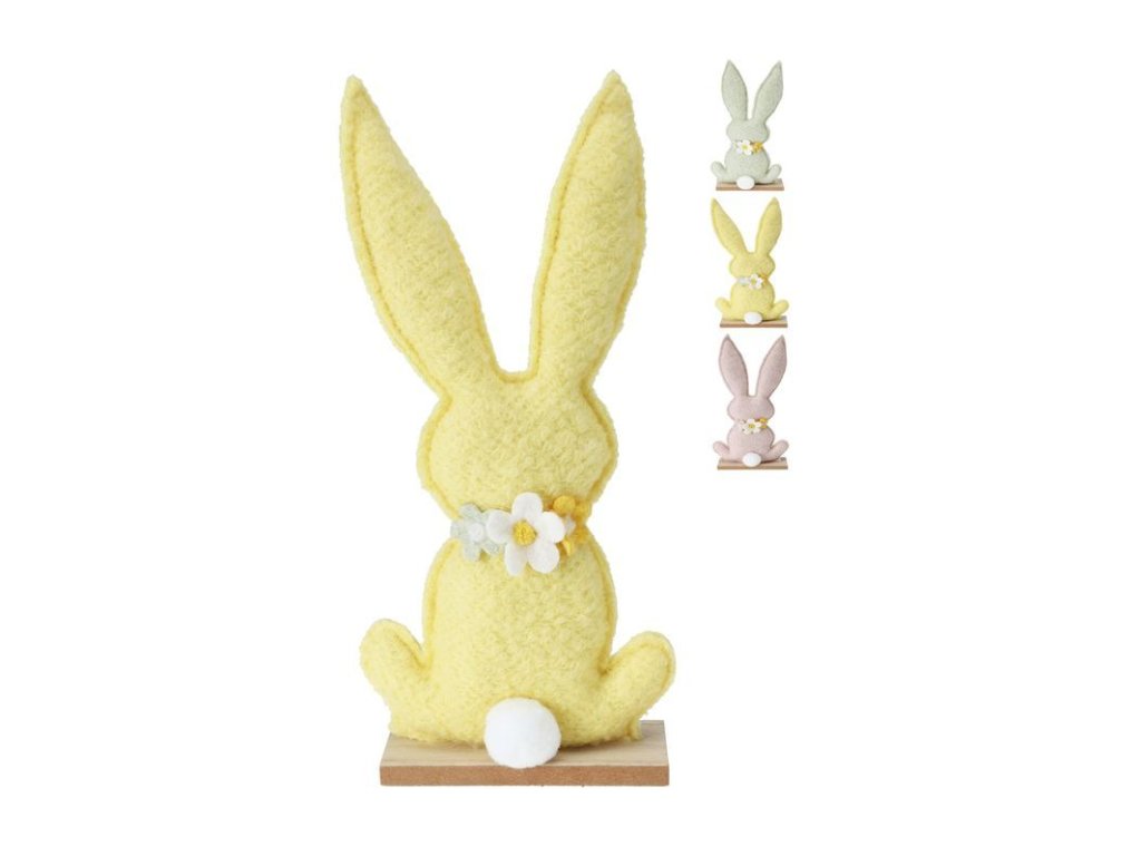 Rozměry: Výška 30 cm, hmotnost 300 g. Materiál: Plst a dřevo. Dostupné barvy: Žlutá, růžová, světle zelená.
