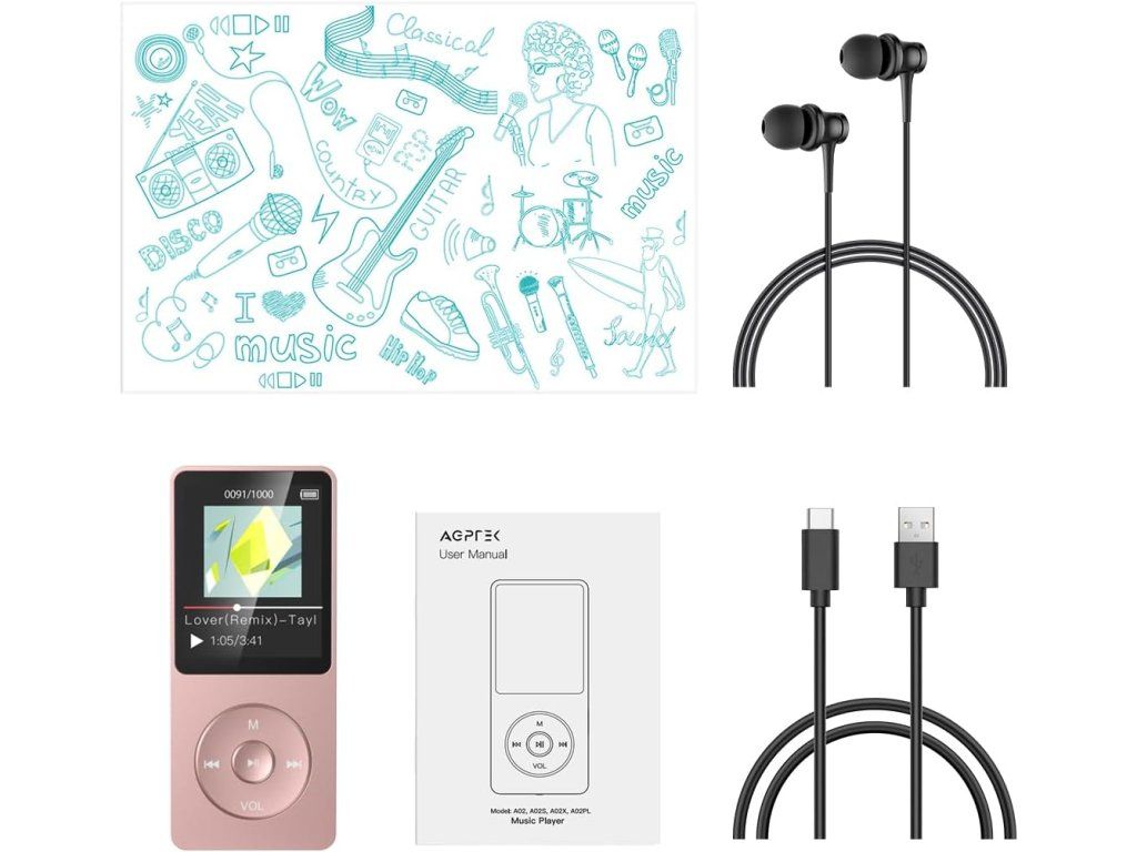 AGPTEK A02 je lehký a výkonný MP3 přehrávač pro sport i každodenní poslech: dlouhá výdrž baterie, čistý zvuk ve více formátech a praktické funkce jako FM rádio a diktovací zařízení.