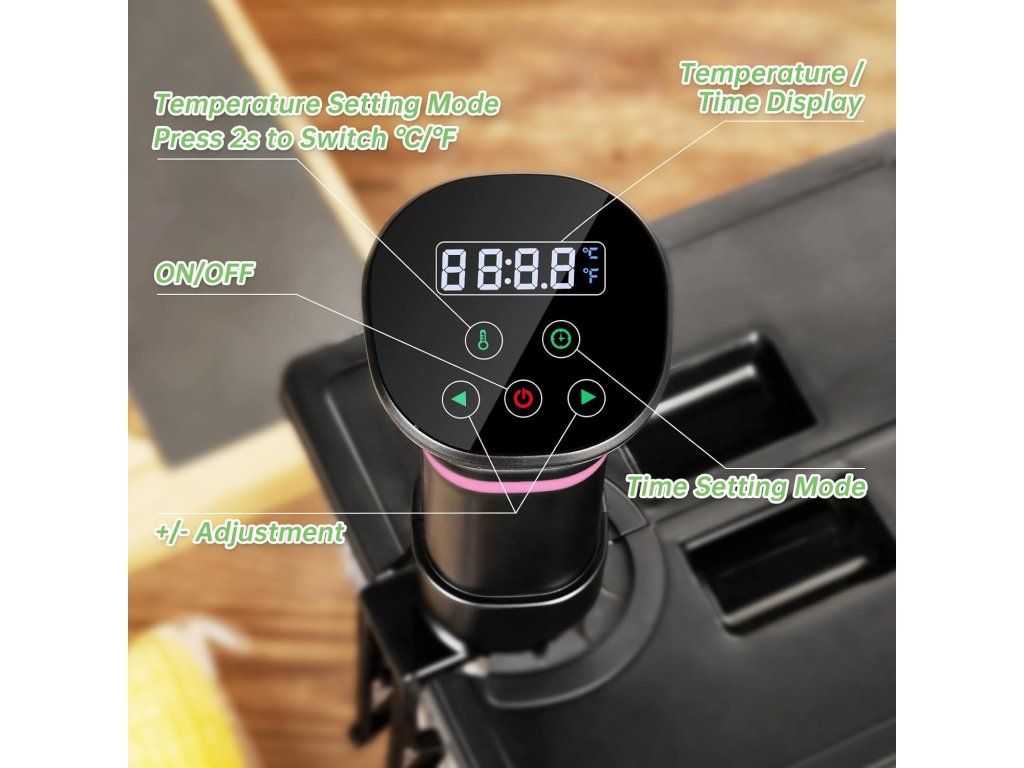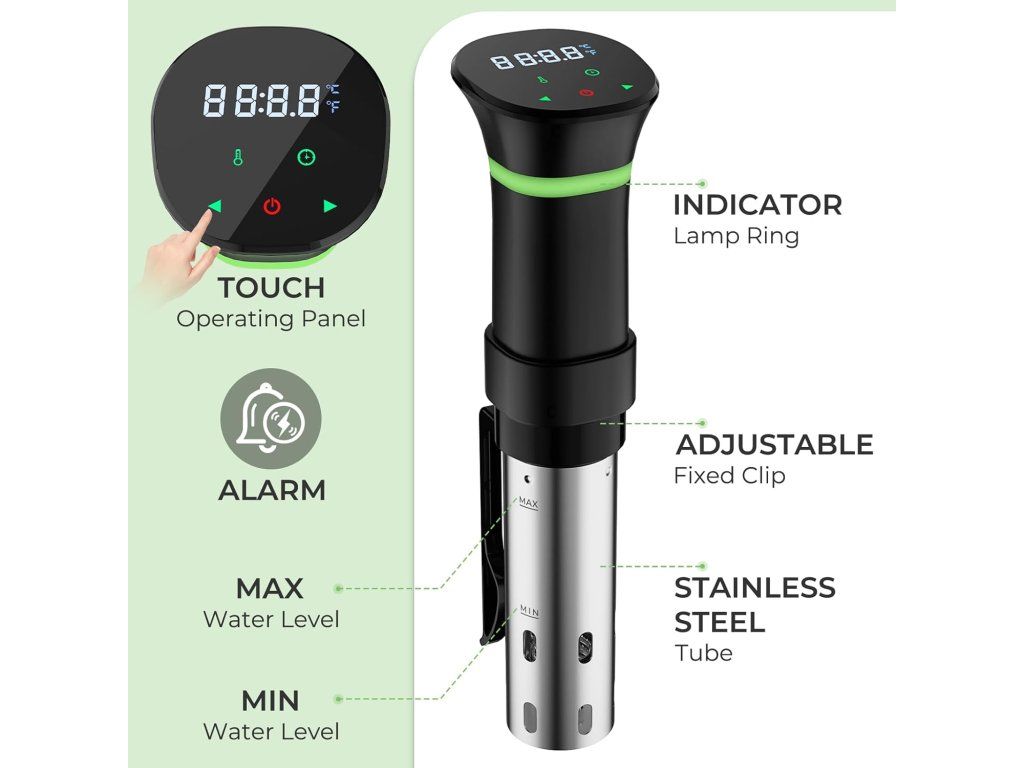 Obsah balení: 1× ponorný cirkulační sous‑vide vařič. Technické údaje: výkon 1000 W, kapacita cca 15 l, teplotní rozsah 25–92,5 °C, max. časovač 99 h, napětí 220 V, materiál nerezová ocel, barva matná černá, rozměry cca 10,7 × 14,0 × 40,6 cm (D׊×V), ovládání dotykové, rok výroby 2023, ASIN B09BJ5VGM4.