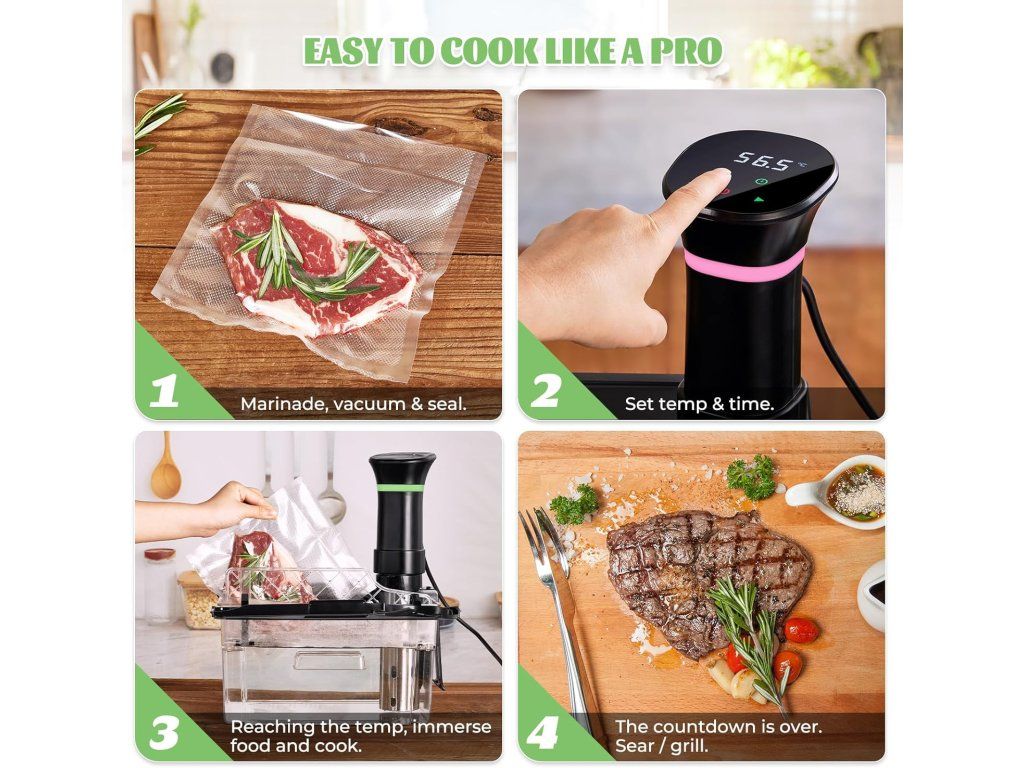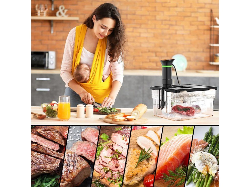 - Zachování chuti a výživy: Sous‑vide vaření udržuje vlhkost a živiny v potravině, výsledkem jsou výraznější a šťavnatější chutě než u konvenčního dlouhého vaření.