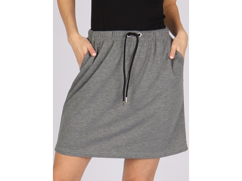 Material: 65% Polyester / 35% Viscose looser cut skirt women's skirt has practical pockets on the sides elastic band sewn into the waist, complemented by a lace with metal ends skirt length is above the knee ideal for everyday wear color grayAdditional parameters