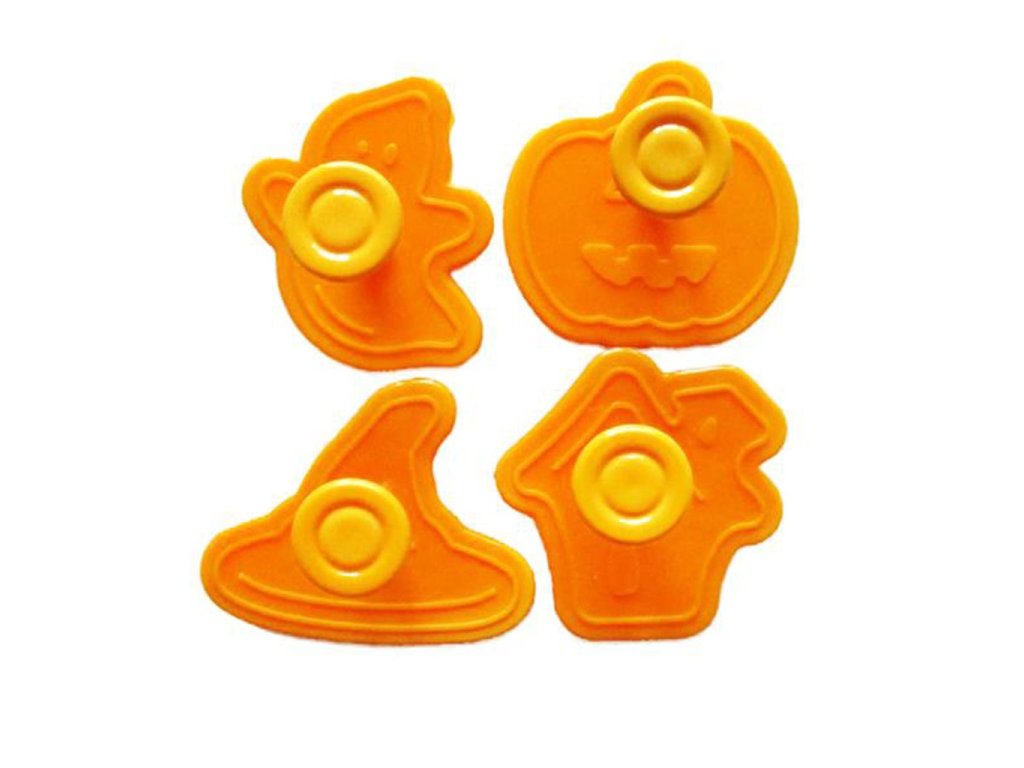 Sušenky s hezkým halloweenským reliéfem ve tvaru ducha, dýně, strašidelného domečku a klobouku vytvoříte snadno a rychle. K tomu dobře poslouží vykrajovačky z PP plastu, které vtlačením do vyváleného těsta vykrojí obrys a zatlačením na píst s ocelovou pružinou se reliéf obtiskne do plochy. Tato razítka ocení velcí i malí pomocníci při pečení sušenek a strašidelných perníčků.Hodí se také na marcipánové ozdoby nebo modelovací hmotu. Velikost sušenek je cca 4/5 x4,5x4,5 cm. Po použití je lze mýt v teplé vodě se saponátem.