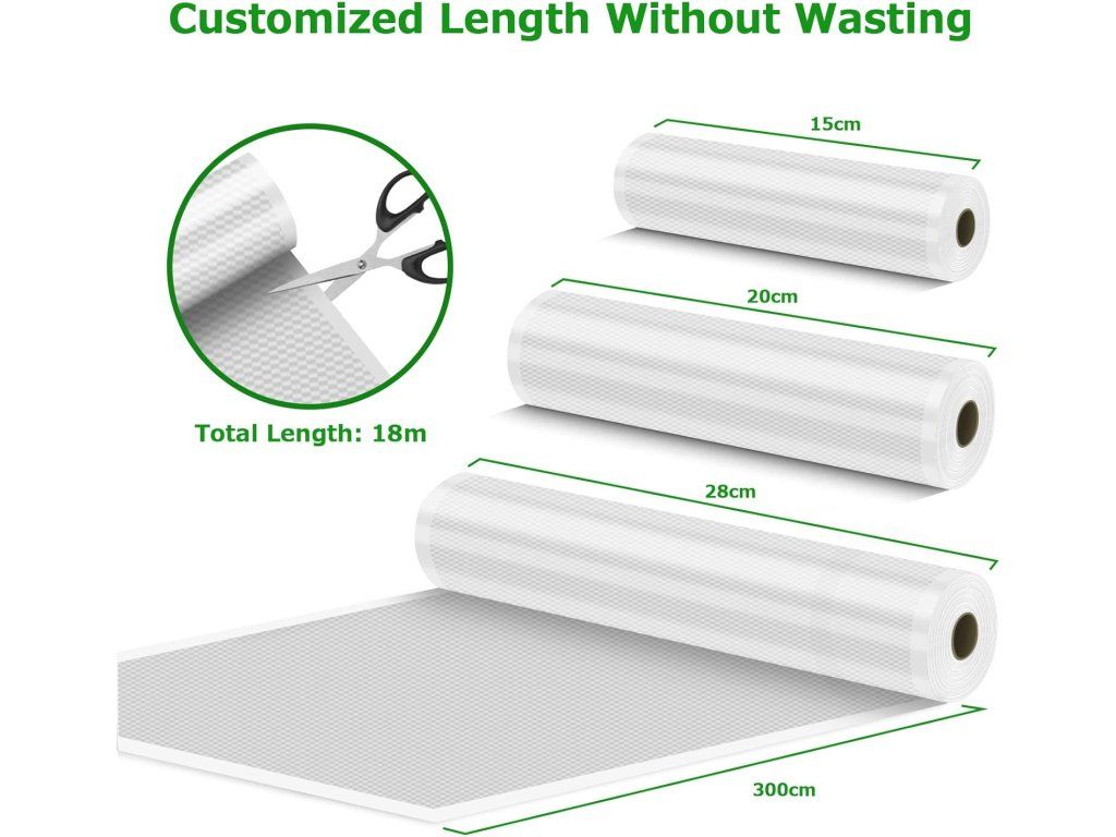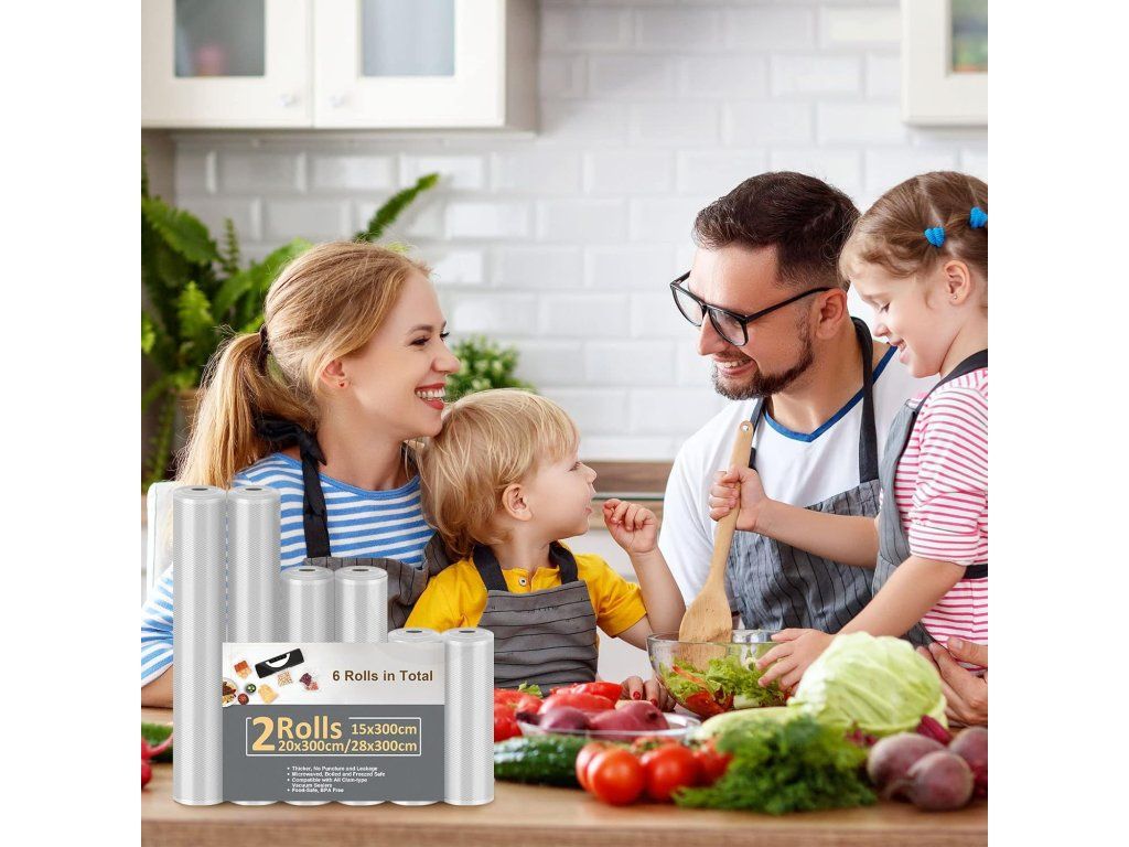 Obsah balení: 6 rolí (2×28×300 cm, 2×20×300 cm, 2×15×300 cm). Technické údaje: materiál bez BPA, opakovaně použitelný po umytí; hmotnost balení přibližně 620 g; rozměry balení 28,4 × 22,4 × 4,1 cm; kompatibilní s většinou vakuovacích strojů, vhodné pro mrazák, lednici, mikrovlnnou troubu a sous‑vide.