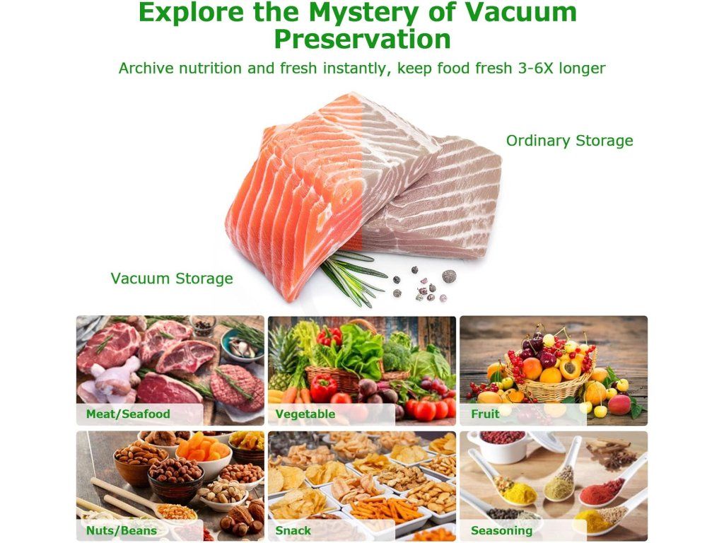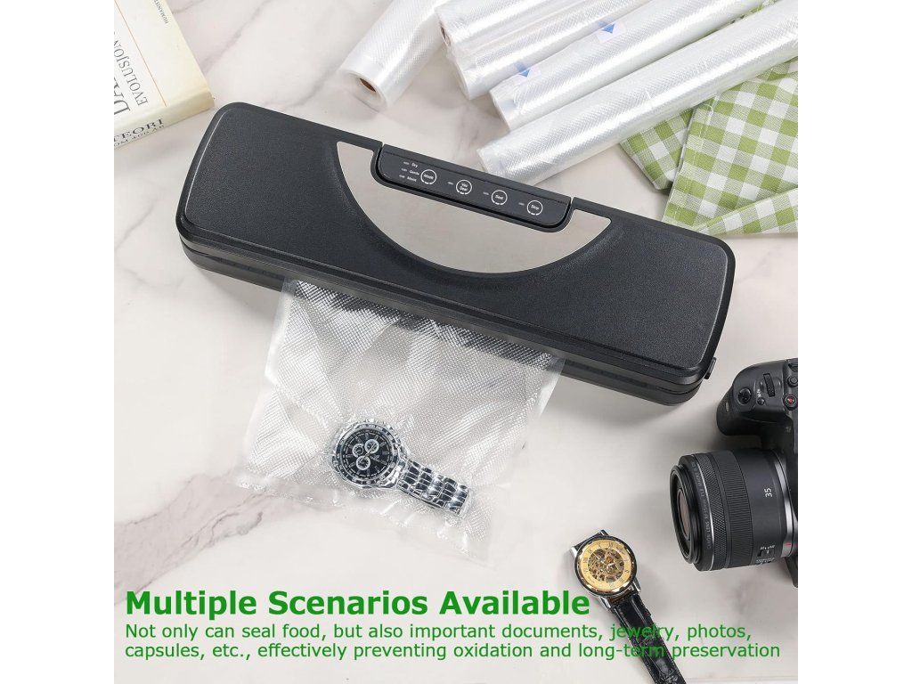 - Dlouhodobé uchování: efektivní vakuování prodlužuje trvanlivost potravin až 3–6×, chrání také dokumenty, léky, šperky či fotografie před vlhkostí a škůdci.