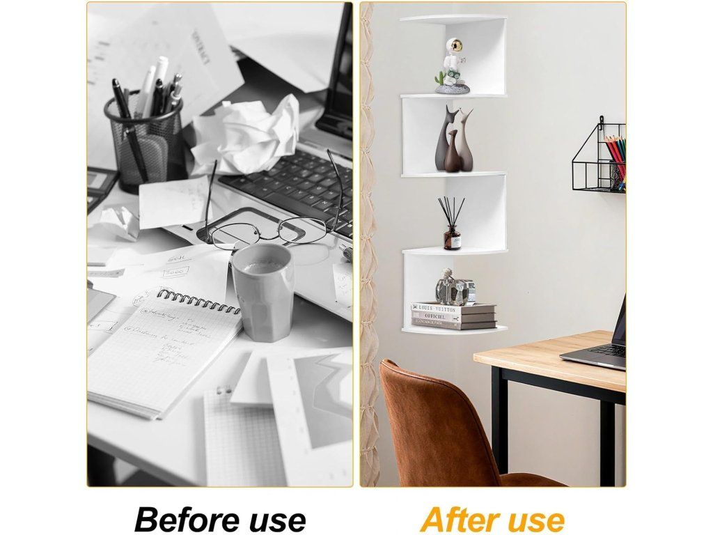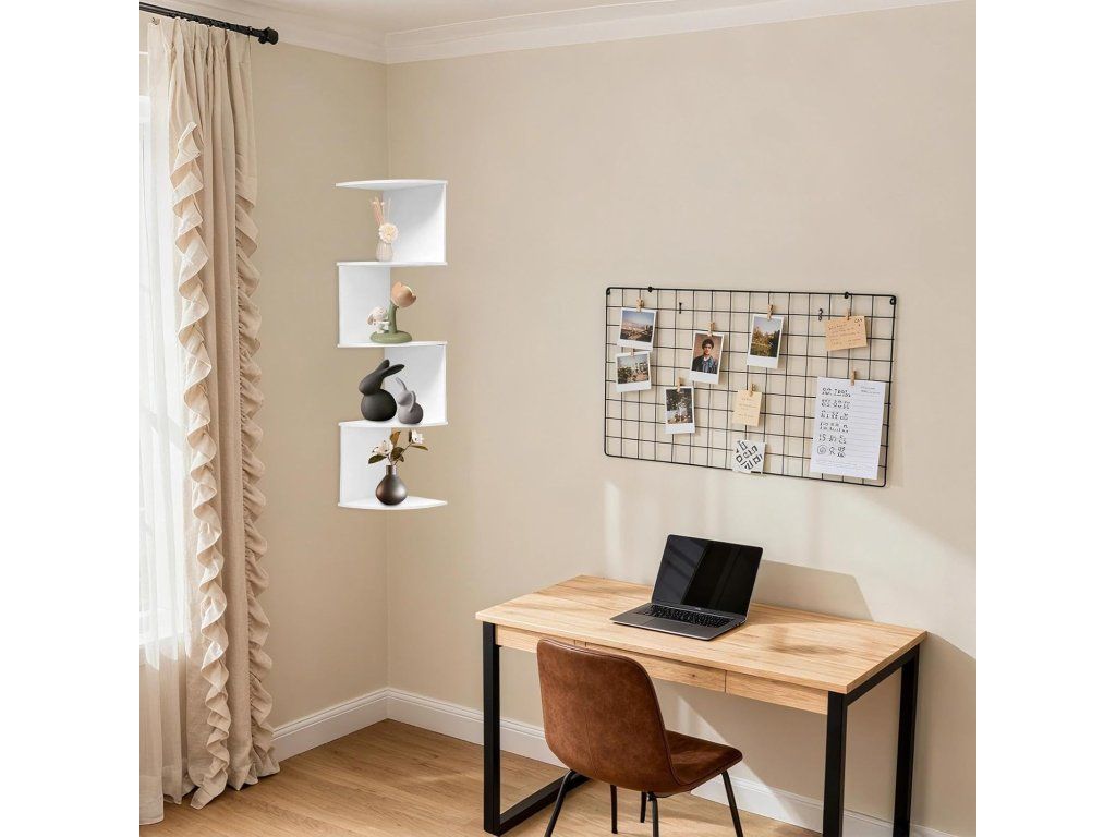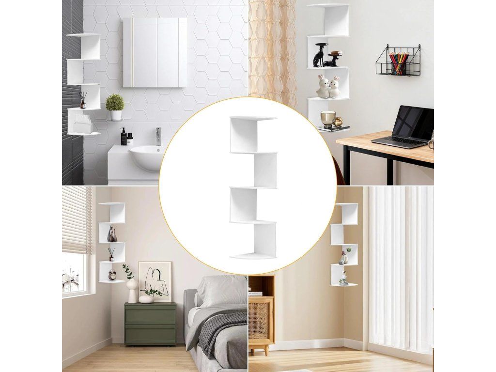 Praktická a dekorativní S‑tvarová rohová police ve střízlivé bílé barvě šetří místo a zároveň esteticky doplní interiér. Vhodná pro vystavení rostlin, knih nebo toaletních potřeb v ložnici, obývacím pokoji i koupelně.