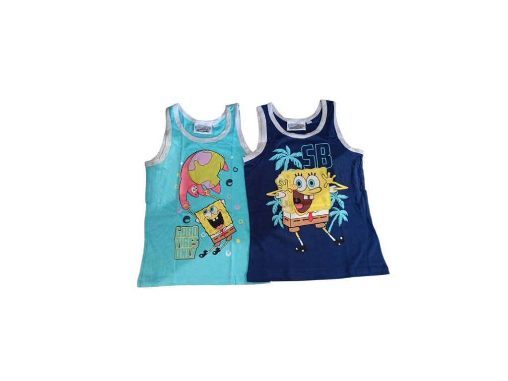 Velkoobchodní nabídka chlapeckých tílek LEVNO - praktická sada 2 kusů s oblíbenými motivy SpongeBoba za výhodnou velkoobchodní cenu. Ideální položka pro rozšíření sortimentu dětského oblečení s garantovanou poptávkou.