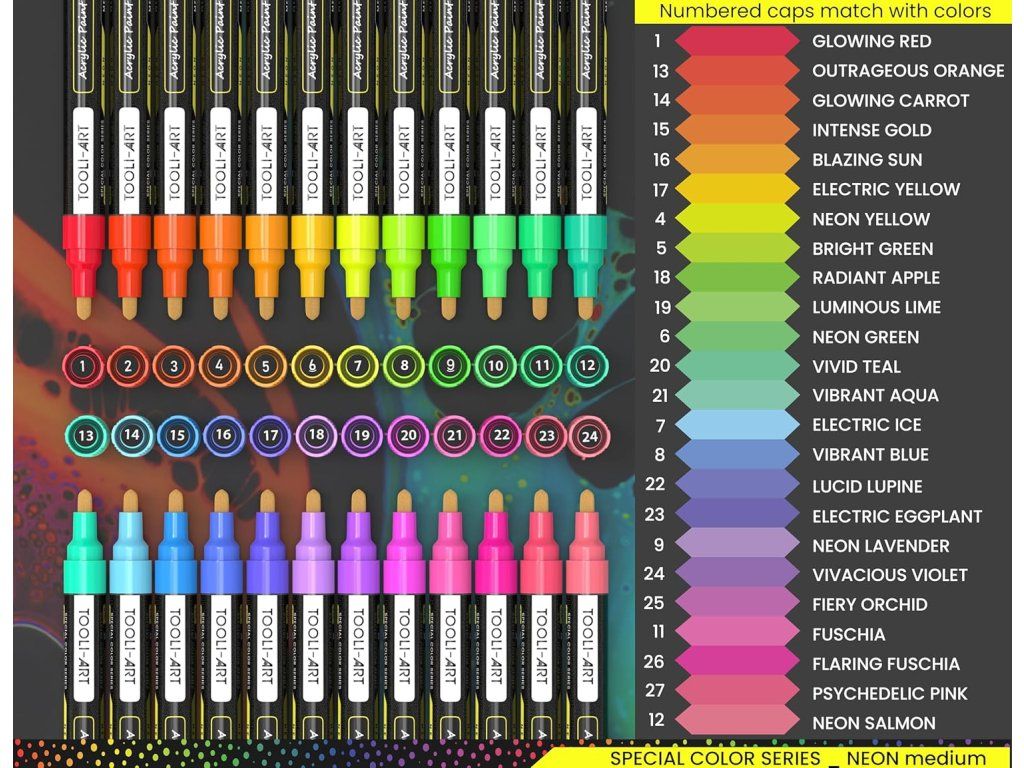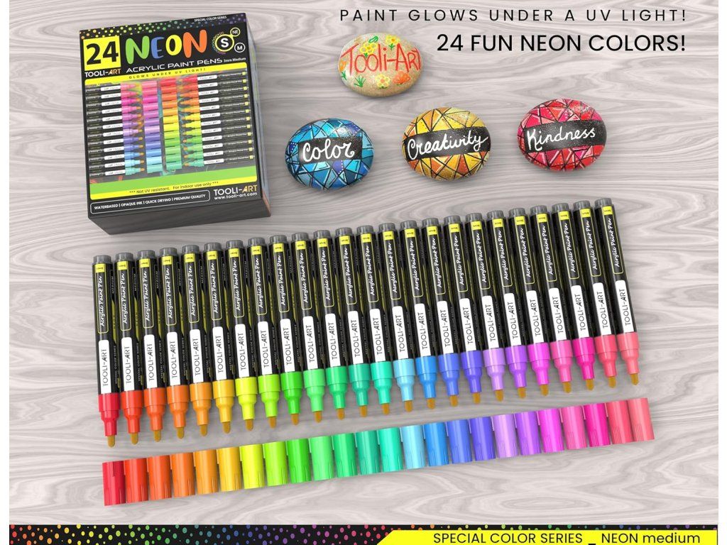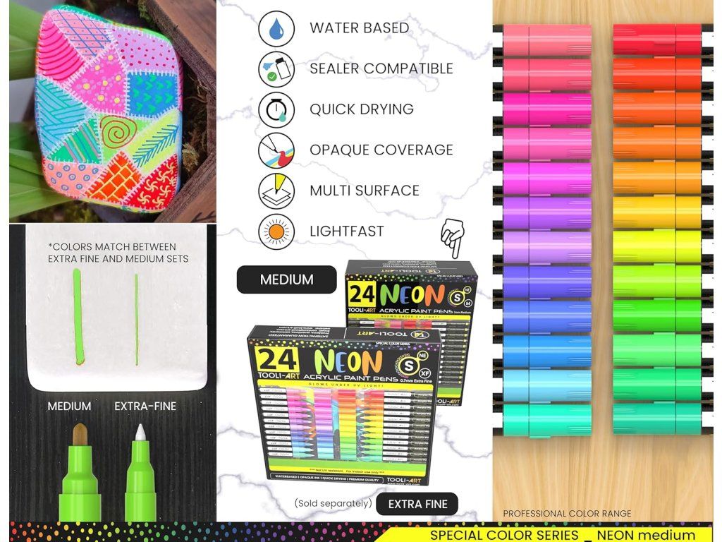 Objevte kreativitu s 24 jasnými neonovými akrylovými popisovači navrženými pro dekorování kamenů, skla, dřeva, kovu, keramiky, plátna i hrnků. Díky krycím pigmentům, rychlému schnutí a střednímu vláknovému hrotu jsou ideální pro malování, obrysy i detailní tečky a mandaly.