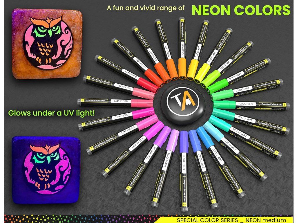- Zářivé neonové barvy: Sada obsahuje 24 sytých neon odstínů, které pod UV světlem svítí a oživí každé dílo. (Pouze pro použití v interiéru, barvy mohou blednout na přímém slunci.)
