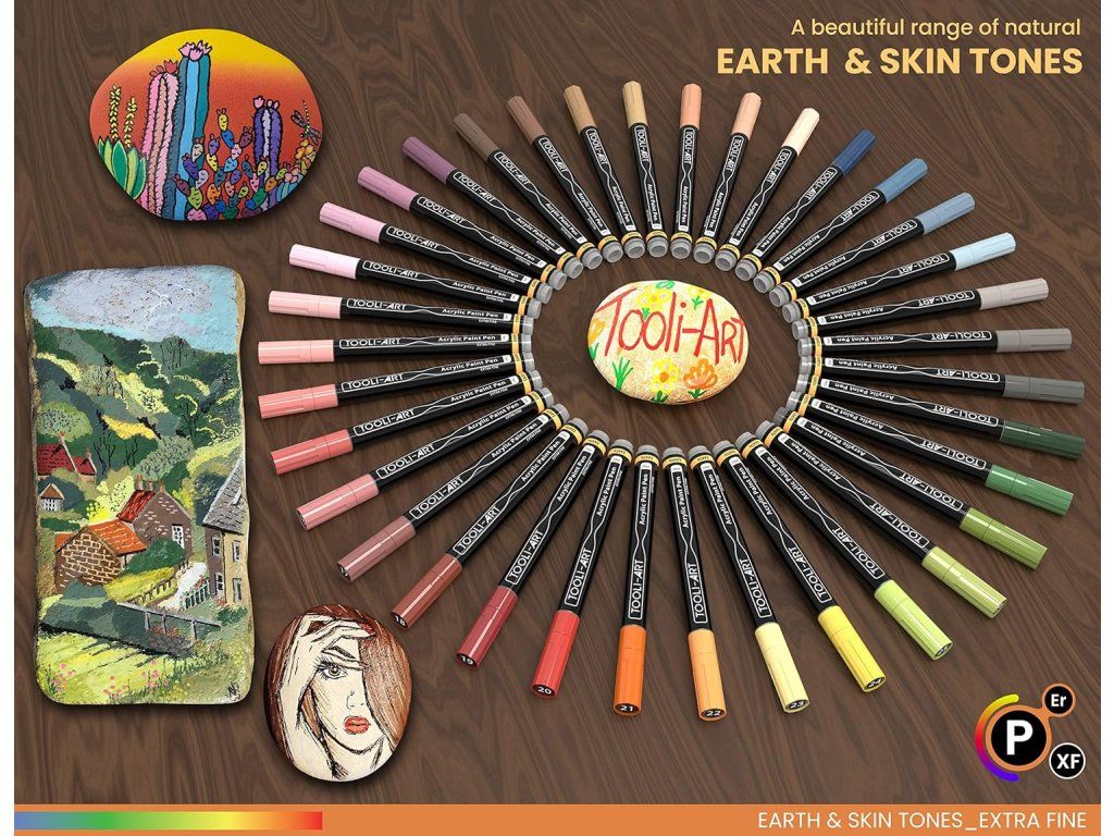 Vysoce pigmentovaná sada 36 akrylových fixů TOOLI-ART v přirozených odstínech pleti a zemských tónech — ideální pro portréty, malbu zvířat, přírodní motivy i precizní dekoraci na kameny, keramiku, sklo, dřevo či textil. Extra jemný hrot a rychlé schnutí zajišťují přesné linky bez nepořádku.