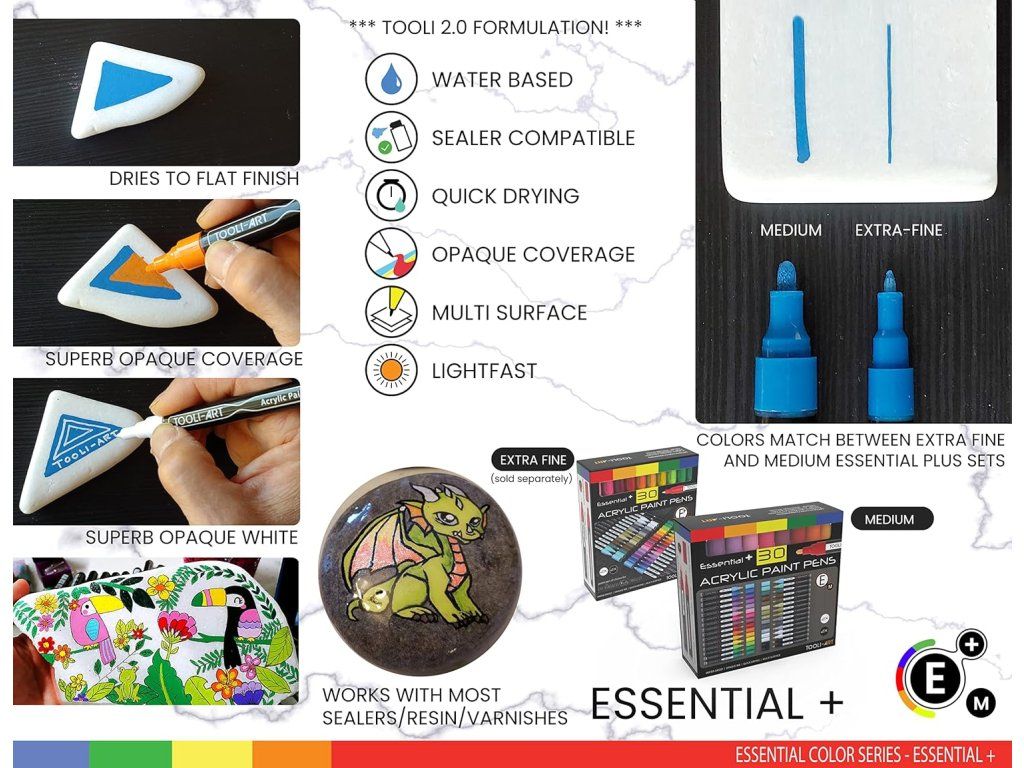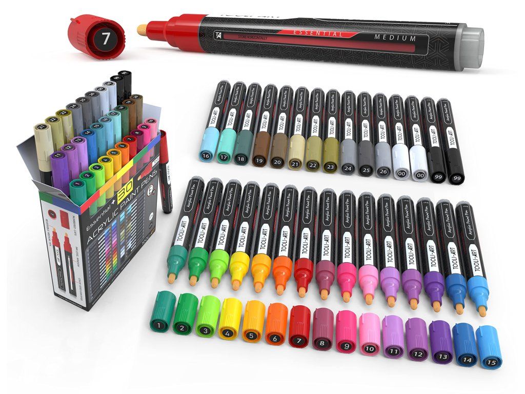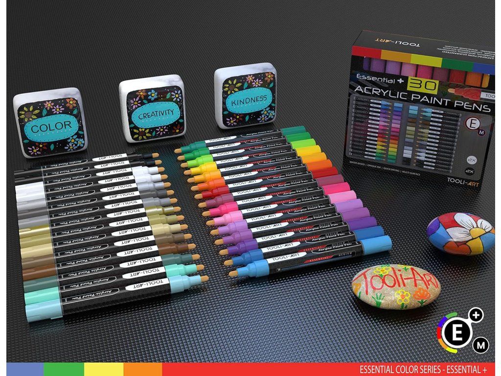 Obsah balení: 30 akrylových popisovačů (včetně 1 extra černého a 1 extra bílého), náhradní hroty. Technické údaje: střední hrot ~3 mm, inkoust vodou ředitelný akrylový, barvy ESSENTIAL M, voděodolné (water resistant), hmotnost balení cca 660 g, počet kusů 30, model AS30, výrobce TOOLI-ART. Doporučeno pro věk 14+; pro dospělé a profesionální použití, nehračka.