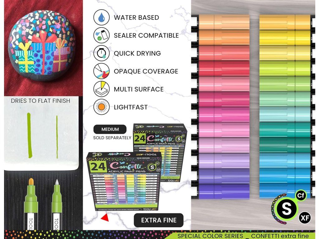 Univerzální sada 24 akrylových fixů Confetti přináší pestré, syté odstíny a precizní ovládání pro vaše DIY projekty, malování kamenů, ilustrace i dekoraci hrnků a skla.