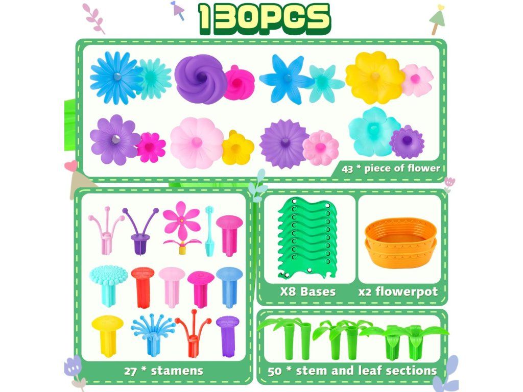- Rozmanitost 130 dílů: Sadá obsahuje listy se stonky, pestíky, stonky dělené na sloupce, květinové hlavy, květináčky a základny v různých barvách.